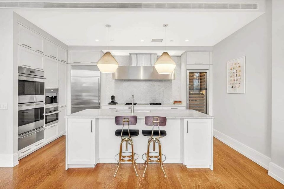 The gourmet kitchen is beautifully outfitted with a striking Bianco Carrara marble island, a wine cooler that holds up to 146 bottles, and top-of-the-line stainless steel Sub-Zero refrigerator, Miele oven, and Wolf range. A spacious powder room is conveniently located just off the living area. Due to its coveted location on the 11th floor, this home is one of the few apartments in the building that offers the variety of Madison Square Park views from the living room as well as west-facing views of the Manhattan skyline from all four bedrooms. Each sun-flooded bedroom includes large ensuite baths, custom closets, and large windows overlooking the city.