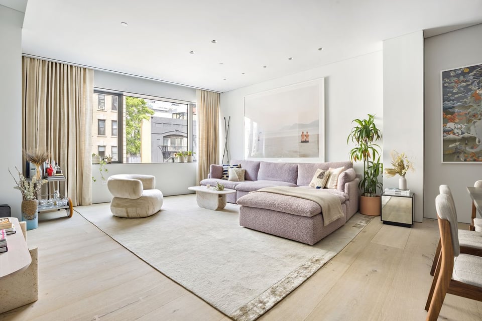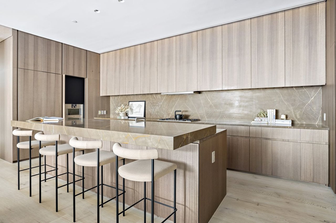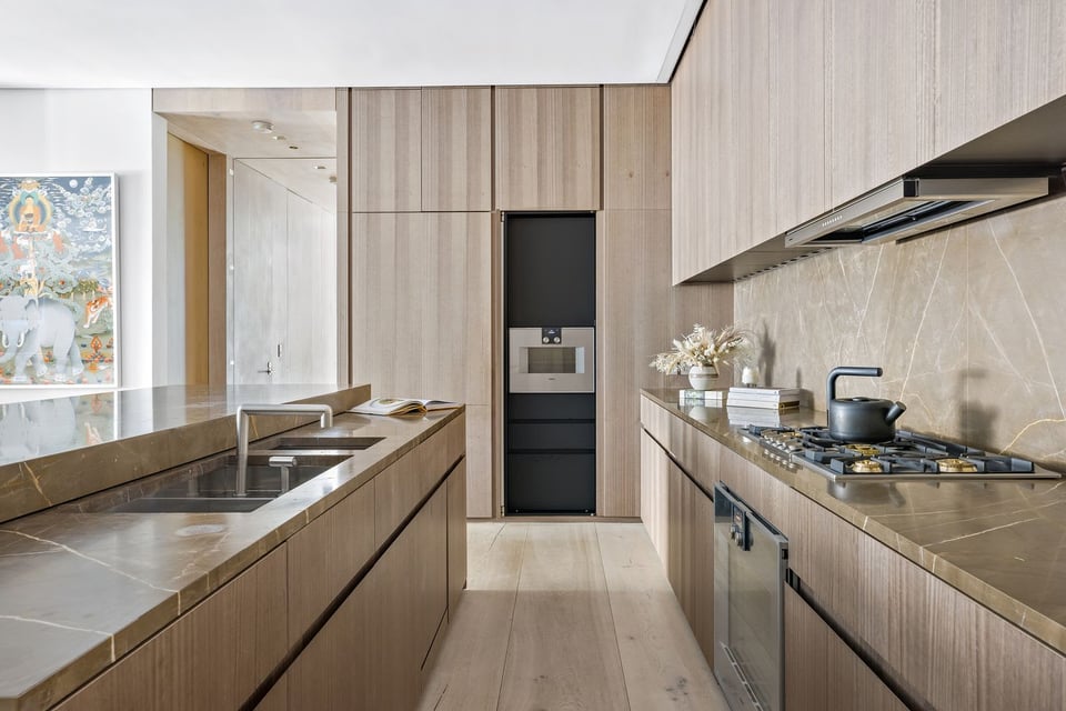 The kitchen is tailor-made by Milan-based firm Minimal and boasts honed Fango marble counters, a sliding island countertop, Italian Eucalyptus wood cabinetry, and a fully integrated Gaggenau appliance package. Adjacent to the grand, open kitchen is a generously proportioned, north-facing living room, ideal for casual lounging and formal entertaining alike.