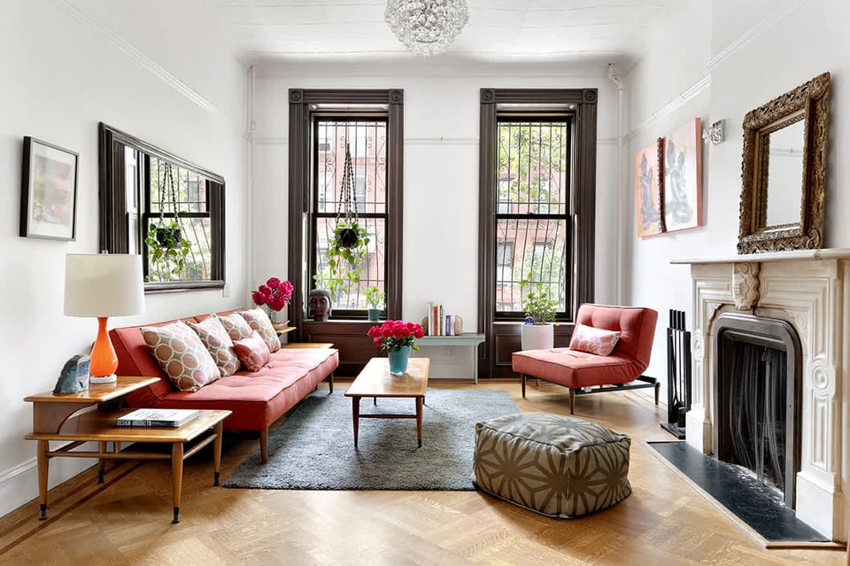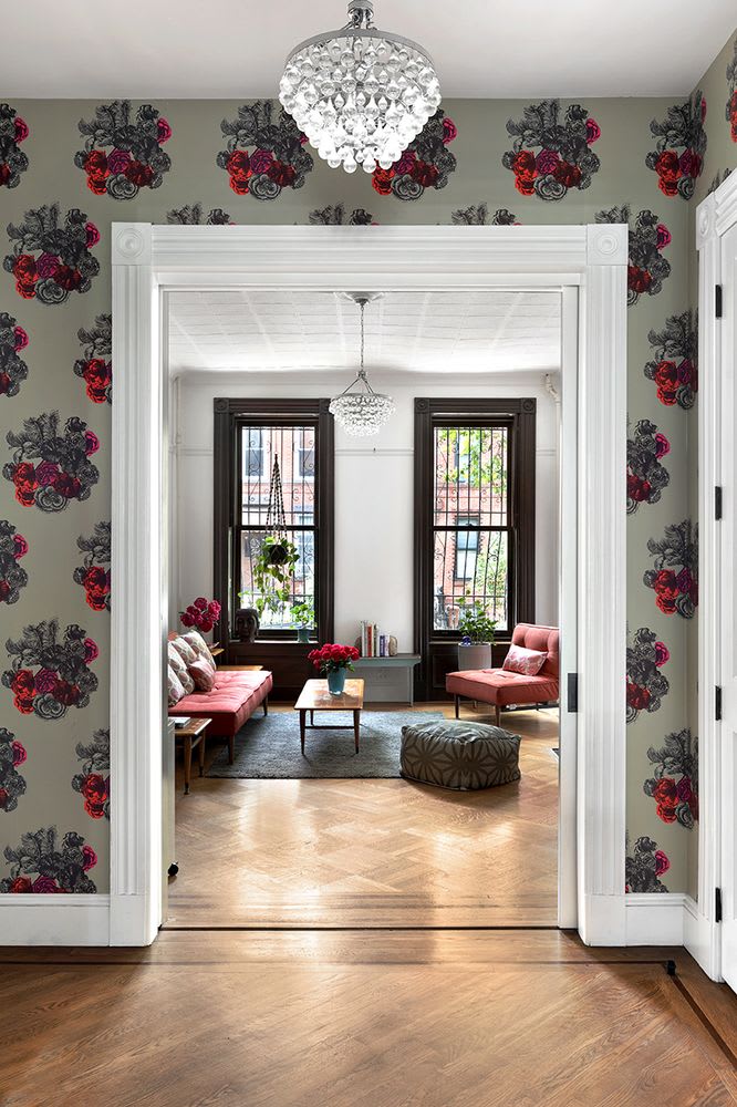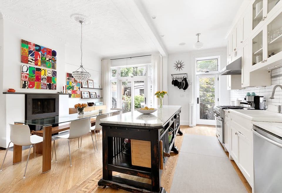 The main entrance to the gracious parlor level proceeds into an ample foyer adorned with Fornasetti wallpaper. A front bedroom, its wood-burning fireplace graced with an original marble mantle, could alternately be used as a den or of-the-moment home office and sits behind sliding pocket doors. Beyond awaits a generous central living room that flows into the open-plan kitchen/dining area for easy entertaining. The stunning chef’s quarters are styled with white cabinetry, a Waterworks tiled wall and backsplash, a bespoke French antique island with marble countertops that carry throughout the kitchen, and premium stainless steel appliances (Thermador stove & vented hood, Fisher & Paykel refrigerator, Bosch dishwasher). A separate pantry provides coveted storage.